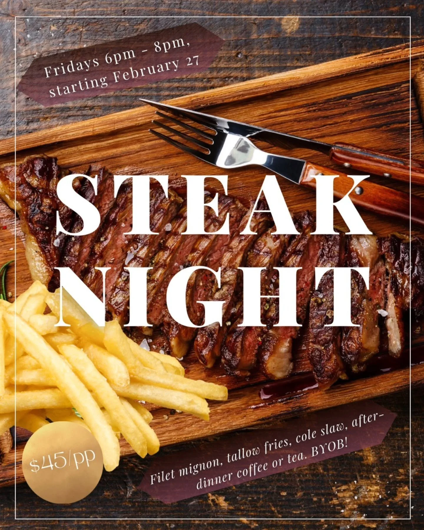 After the incredible success of our Valentine’s Day dinner, we are launching Steak Nights on Fridays from 6-8pm! Featuring Chef Bruce Byrd’s signature Filet Mignon done to perfection, shoestring potatoes fried in beef tallow, and delectable cole slaw, this is a steak dinner at its very best.